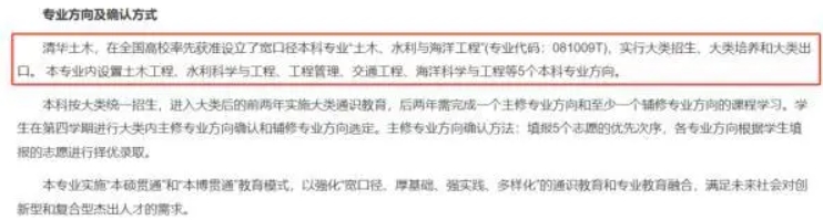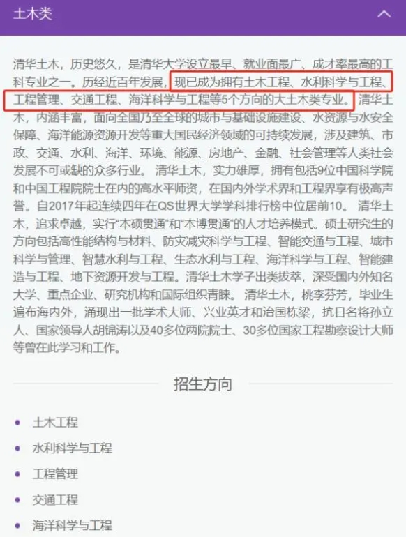 據(jù)查詢清華大學(xué)本科招生網(wǎng),在“土木類”招生專業(yè)下,明確說明了清華土木“現(xiàn)已成為擁有土木工程、水利科學(xué)與工程、工程管理、交通工程、海洋科學(xué)與工程等5個(gè)方向的大土木類專業(yè)”。