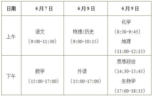 全國(guó)統(tǒng)考科目由教育部命題,按教育部規(guī)定時(shí)間組織考試。選擇性考試科目由我區(qū)自主命題,每門考試時(shí)長(zhǎng)均為75分鐘,與全國(guó)統(tǒng)考科目的考試同期安排,如全國(guó)統(tǒng)考科目有調(diào)整,選擇性考試科目的考試安排相應(yīng)調(diào)整。具體考試時(shí)間安排如下: